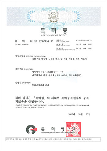 Patent No. 10-1192984An SMPS-Integrated LED Head and a Skin Therapy Device Using the Same.