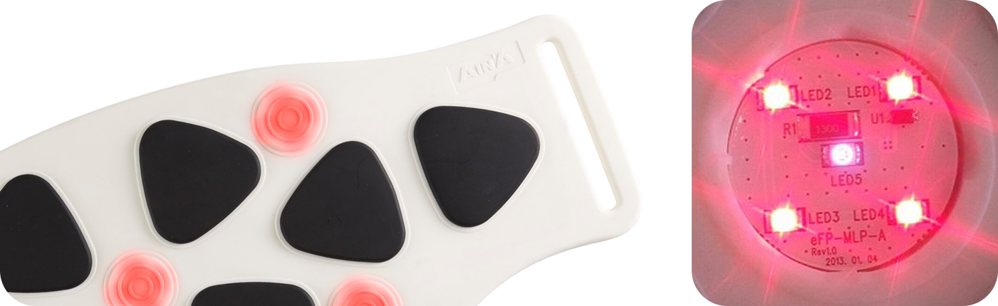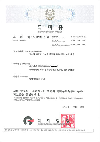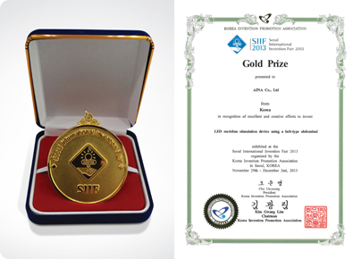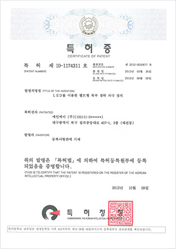 Patent No. 10-1174311A Belt-Type Abdomen Meridian Stimulation Apparatus Utilizing LEDs.Featuring a circular module that integrates a combination of various LED light wavelengths, this device delivers rapid and effective responses. This core patented technology was awarded the Gold Medal at the Seoul International Invention Fair (SIIF).