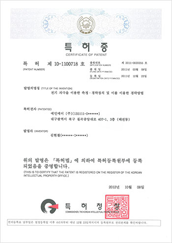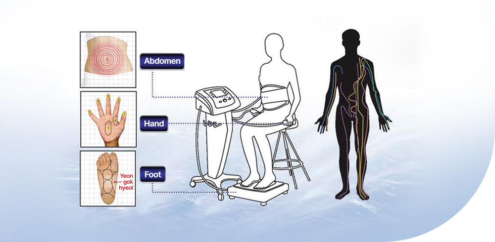 Patent No. 10-1100718Apparatus for Measuring Meridians Using Electrical Stimulation and a Method Thereof.This device applies low-frequency electrical stimulation to the hands, abdomen, and feet, utilizing repeated muscle contractions and relaxations to alleviate tension and relieve pain in the shoulders, back, and legs.