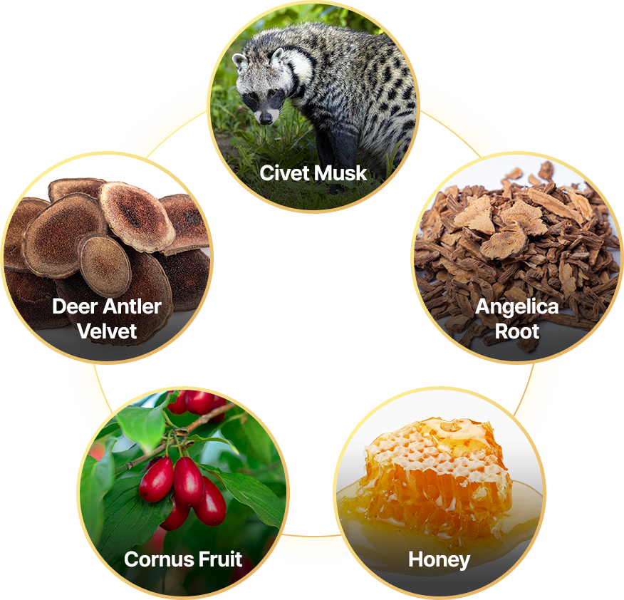 | Ingredients | Sugar-fed Honey (Product of Korea), Angelica Root Powder (Angelica Root: Product of Korea), Cornus Fruit Powder (Cornus Fruit: Product of Korea), Deer Antler Velvet Powder (Deer Antler Velvet: Product of New Zealand), Natural Flavor [Civet Musk (Civet: Product of Ethiopia)], Gold Leaf | Dosage and Directions | For adults, take one pill once a day. Chew the pill before or between meals and consume with water./td> |